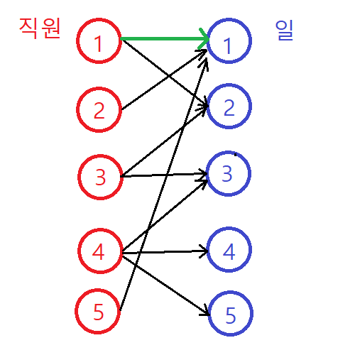 일단 1번 일을 맡은 직원이 없어 1번 직원과 1번 일을 매칭해주고, 매칭 가능하다는 뜻의 true를 반환한다.