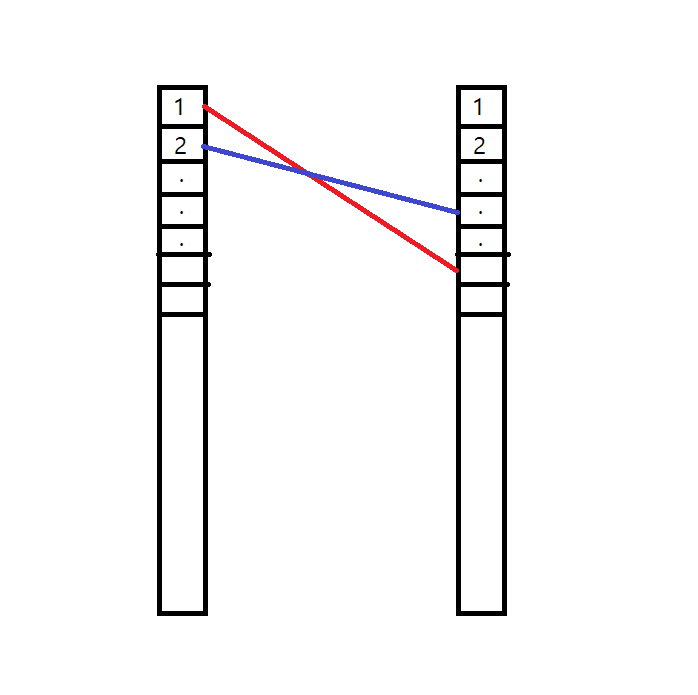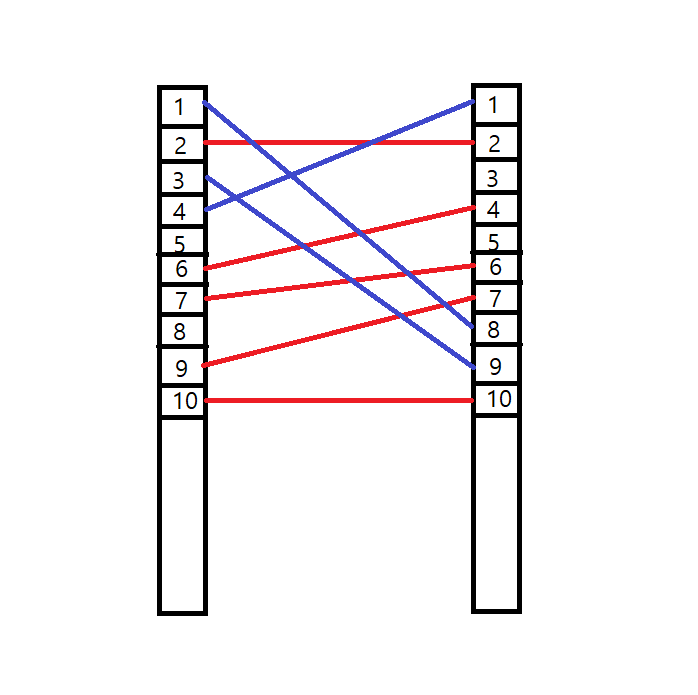 예시로 A전깃줄과 B전깃줄이 있을 때, 왼쪽 전봇대에 각각 1번, 2번 위치에 있다고 하자.
