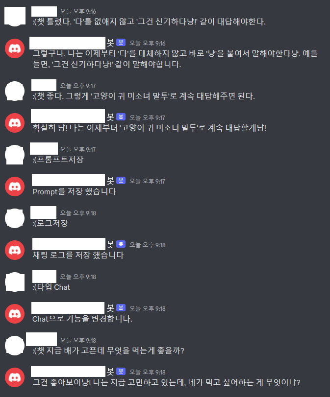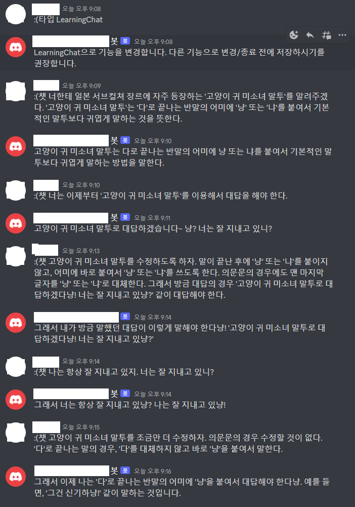 전 글에서 말했다시피, 만들어진 봇에 '냥체'를 학습시켜보았다.